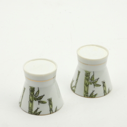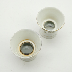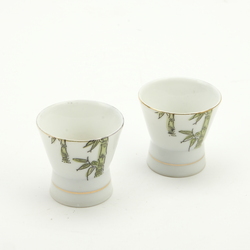 | Omschrijving | Lot van twee 20e eeuwse Japanse rijstewijnkopjes met bamboedecor aan de buitenkant en erotische voorstelling onder bolglas aan de binnenkant |