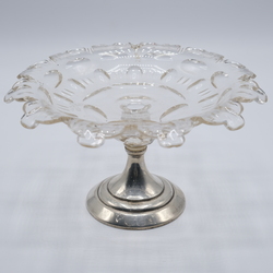 Kristallen fruitschaal op grote ronde zilveren voet.