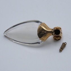 | Omschrijving | Een antiek puntig geslepen kristallen parfumflacon met een 14 krt gouden hals en dop. |