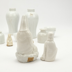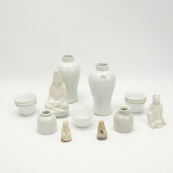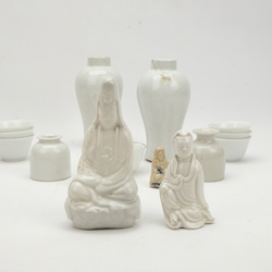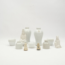 | Omschrijving | Lot divers Blanc de Chine porselein, waaronder twee grotere en twee kleine sculpturen, Quanyins |