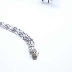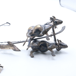 | Omschrijving | Lot divers zilver: een derde gehalte (800/1000) Indonesisch zilver miniatuur van een ploegende boer met twee ossen, gemerkt '800MD', een tweede gehalte (835/1000) zilveren armband met ronde bloedkoraal en een lipstickhouder |