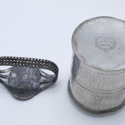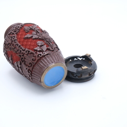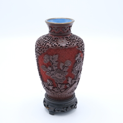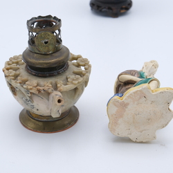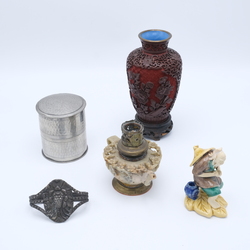| Omschrijving | Lot diversen: een derde gehalte zilveren Indonesische servetring, een Chinees 20e eeuws cinnabar vaasje, een 20e eeuws Chinees sculptuur, Chinees speksteen olielampje en tinnen doosje, gemerkt C.K.L. Muntok |