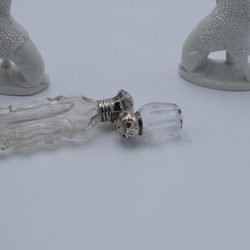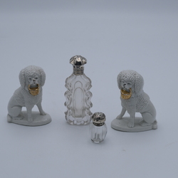 | Omschrijving | Lotje divers: een 19e eeuwse kristallen parfumflacon met zilveren dop, twee 19e eeuwse Engelse sculpturen van hondjes, zgn. ‘hoerenhondjes’ en een klein kristallen potje met Engels zilveren dop |