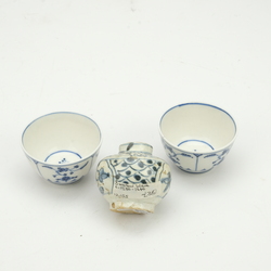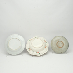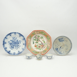 | Omschrijving | Lot divers porselein: een 18e eeuws octagonaal porseleinen bord, met Chinoiserie decor Derby, een 18e eeuws chinees Qianlong bord, een studiokeramiek blauw-wit bord, een Ming Swatow vaasje, 1580-1640, en twee 18e eeuwse kopjes, Tournay |