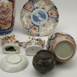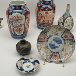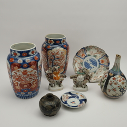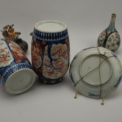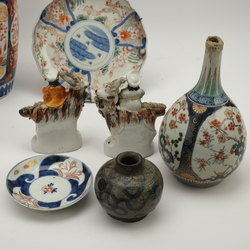 | Omschrijving | Lot divers porselein: twee 19e eeuwse Japans imari vazen, 18e eeuwse Japanse pijpvaas, 18e eeuws Japans schoteltje, 19e eeuws Japans bordje, twee Staffordshire bokkenrijders en een 16e/17e eeuws Chinees blauw-wit gedecoreerd swatow potje. |