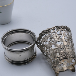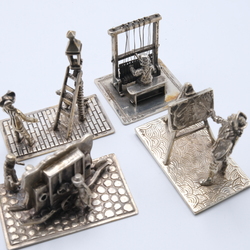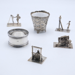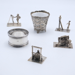 | Omschrijving | Lot divers zilver: vier tweede gehalte (835/1000) zilveren miniaturen, man met ladder bij straatlantaarn, man bij weefgetouw, drie figuren bij draaiorgel en schilder bij schildersezel. Met daarbij een zilveren servetring en zilveren houdertje voor eierdopje |