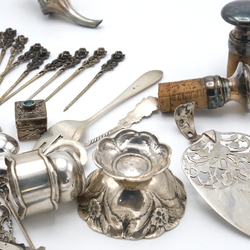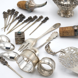 | Omschrijving | Een lot divers zilver, bestaande uit tweede gehalte (835/1000) zilveren schenktuit, twee servetringen, opengewerkt taartschapje, drie theelepeltjes, suikerschepje, vorkje, elf cocktailprikkers, doosje en theezeefje op lekbakje. Met daarbij twee verzilverde kurken, Christofle. |