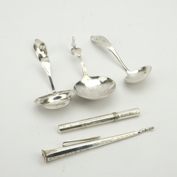 | Omschrijving | Lot divers zilver: een zilveren naaldenkokers, drie roomlepels (één beschadigd) en een breinaaldenhouder. |