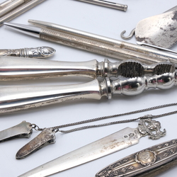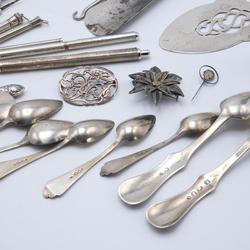 | Omschrijving | Groot lot divers zilver, waaronder zilveren pennetjes, een zilveren notenkraker, naaigerei, divers schepwerk, enkele broches etc. |