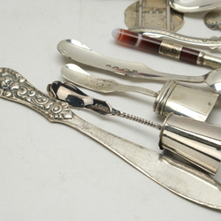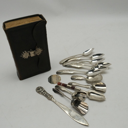 | Omschrijving | Lot divers zilveren schepwerk, waaronder zes 19e eeuwse tweede gehalte (835/1000) zilveren theelepels, vier tweede gehalte zilveren suikerschepjes, een theeduipje en een djokja zilveren brievenopenener. Met daarbij een Bijbel met tweede gehalte (835/1000) zilveren slot |