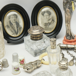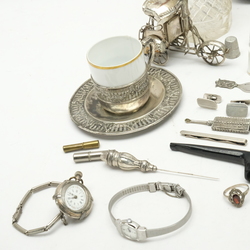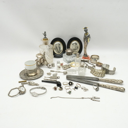| Omschrijving | Lot diversen, waaronder een zilveren rammelaar, kristallen parfumflacon met zilveren dop, zilveren dameszakhorloge, eerste gehalte zilveren sculptuur A. Gianelli en een derde gehalte zilveren schotel en montuur voor kop |