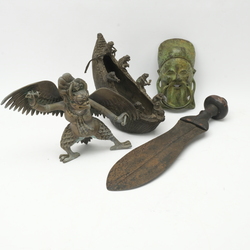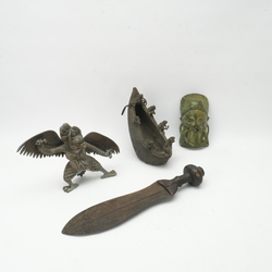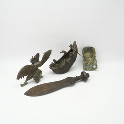 | Omschrijving | Lot van drie Afrikaanse beelden en een Afrikaans zwaardmes, vermoedelijk Kuba stam, Congo. |