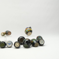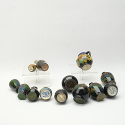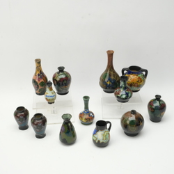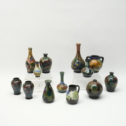 | Omschrijving | Een lot met dertien stuks Gouds glans en mat plateel. Bestaande uit diverse minatuur vaasjes. Met florale decors. Van verschillende plateel fabrieken. |