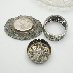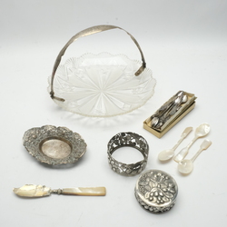 | Kavel | 1691. Lot met divers zilver, verzilverd, parelmoer en een kristallen schaal. |
