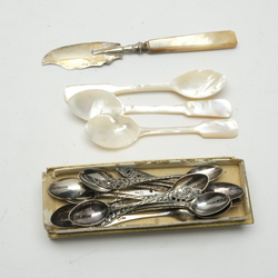 | Omschrijving | Een lot met twaalf verzilverde theelepeltjes, drie parelmoeren eilepels, Kristallen schaal met 2e gehalte (835/1000) zilveren beugel en een jampothouder met deksel. Hierbij nog Djokja (800/1000) Zilveren gehammerd schaaltje en een 1e gehalte (925/1000) zilveren boterspatel aan parelmoeren heft. |