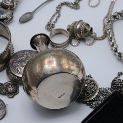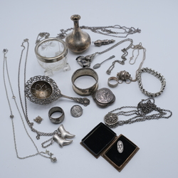 | Omschrijving | Lot met diverse sieraden, bestaande uit servetringen, breipennendoppen, colliers en een vaasje. Waaronder 2e gehalte, 835/1000 en 3e gehalte 800/1000 zilver. |