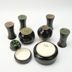 | Omschrijving | Een lot met zeven stuks Gouds glansplateel. Bestaande uit diverse vaasjes, rond deskeldoosje en een bloemsteker. Van verschillende plateel fabrieken. |