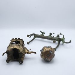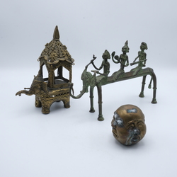 Lot van drie bronzen beelden, waaronder Boeddha met drie gezichten