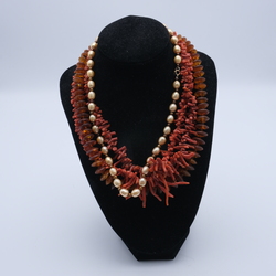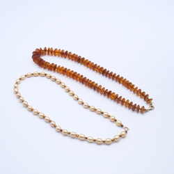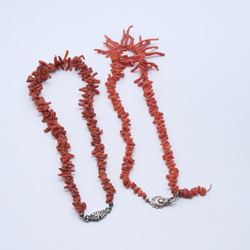 | Omschrijving | Lot van vier colliers: twee bloedkoralen staafjescollier met zilveren slot, een amberkleurig collier met zilveren slot en een parelcollier met 14 karaats (585/1000) geelgouden sloten |