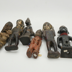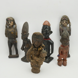 | Omschrijving | Lot met zes Afrikaans houten sculpturen. Diverse stammen en gebieden. Waarvan een aantal met glaskralen. |
