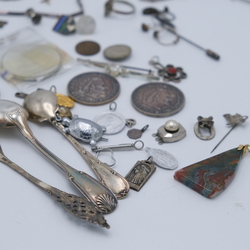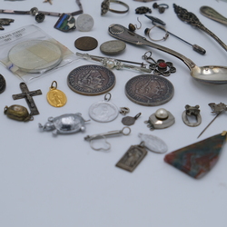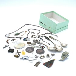 | Omschrijving | Lot divers zilverd en verzilverd, waaronder twee Rijksdaalders, een 10 Gulden munt, enkele stuks schepwerk en sieraden |