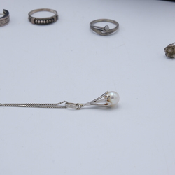 | Omschrijving | Lot diverse zilveren sieraden, waaronder een collier met 18 karaats (750/1000) witgouden hanger met parel, ringen, creolen, een jaren eerste gehalte (925/1000) zilveren armband, gemerkt '84 NU' en een dasspeld met voorstelling van een paard |