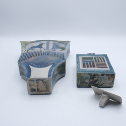 | Omschrijving | Een keramieken vaas op smalle voet en een flesvaas met dop. Polychroom met decors van paarden en blokken en cirkels. Gemerkt op de onderzijde N. Janssens 1996. |