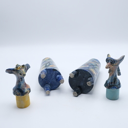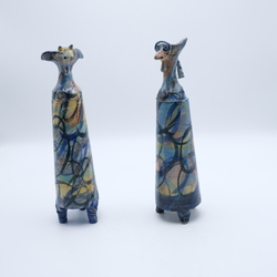 | Omschrijving | Twee keramieken karaffen met stoppen in de vorm van dierenkoppen. Polychroom beschilderd en op drie voetjes. Ontwerp en gesigneerd Netty Janssens. |