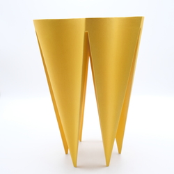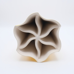 | Omschrijving | Een geel glazuurde aardwerken designvaas, rustend op zes punten. Ontwep en gemerkt Sasja Scherjon (1958) voor Cor Unum. |