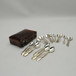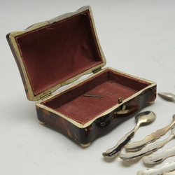 | Omschrijving | Een antiek 19e eeuws schildpad lepeldoosje, op bolpootjes, gevuld met achttien tweede gehalte (835/1000) zilveren advocaat- en theelepeltjes |