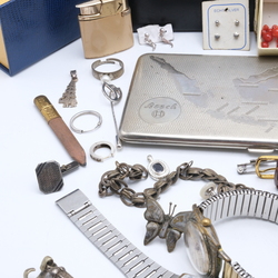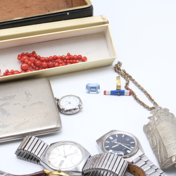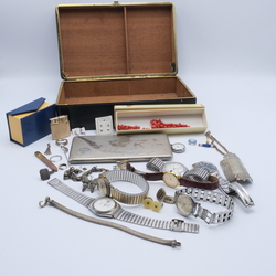 | Omschrijving | Sieradendoosje gevuld met diverse sieraden, waaronder vintage herenhorloges. |