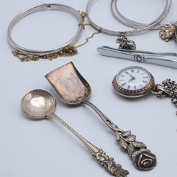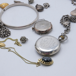 | Omschrijving | Sieradendoosje gevuld met divers zilver, verzilverd en verguld, waaronder enkele zilveren dameszakhorloges. |