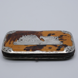 | Omschrijving | Schildpad sigarenkoker, versierd met zilverwerk, met onder meer een afbeelding van een F riese boerderij. |