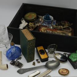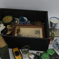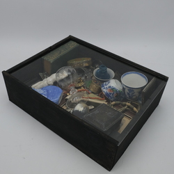 Houten tafelvitrine gevuld met diverse snuisterijen