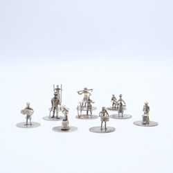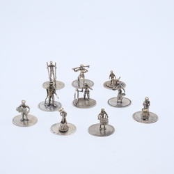 | Omschrijving | Lot van tien tweede gehalte (835/1000) Nederlands zilveren miniaturen op ovale voet. O.a. jager, steltloper, man met hond, man met hoepel, vrouw met karnton, vrouw met spiegel, accordeonspeler en trommelaar |