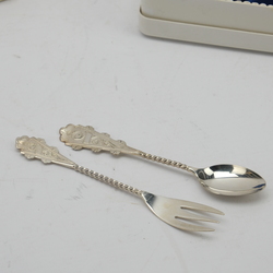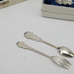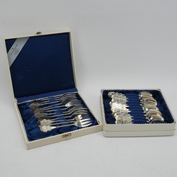 | Omschrijving | Lot van twaalf tweede gehalte (835/1000) zilveren vorkjes en twaalf lepeltjes, allen gemerkt van der Meulen, Joure. |
