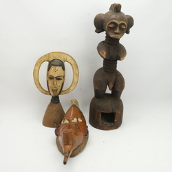 | Omschrijving | Twee Afrikaans houten, Vrouw figuur en een figuur met dubbele gezichten en een masker, polychroom beschilderd. Sunato en een Bacule Yaure. Afkomstig van Ivoorkust |