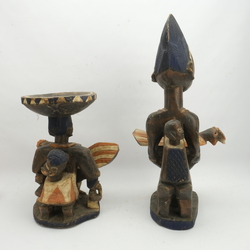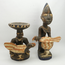 | Omschrijving | Twee houten Afrikaans houten sculpturen van een Afrikaanse vrouw figuren met kip, als dekseldoos. Met resten van polychromie |