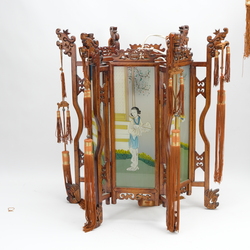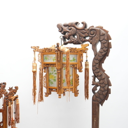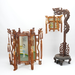 | Omschrijving | Twee 20e eeuwse Chinese lampen, één hanglamp en één tafellamp, met snij- en steekwerk en beschilderde glazen raampjes Conditie: een lamp beschadigd |