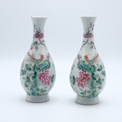 | Omschrijving | Twee Chinees porseleinen Famille Rose gespiegelend pijpvazen. Met een decor van twee goudfazanten tussend de pioenrozen. Vroeg 19e eeuws. |