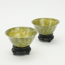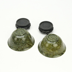 | Omschrijving | Twee Chinees uit groen mineralen (zgn Spinace jade) gestoken kommen op houten sokkels. 20e eeuws of ouder. |