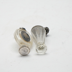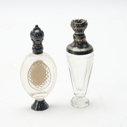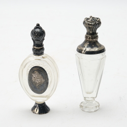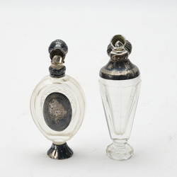 | Omschrijving | Lot van twee antieke 19e eeuwse kristallen parfumflacons met tweede gehalte (835/1000) zilveren montuur. Eén ovaal model met ruitslijpsel op de achterzijde, zilveren plaquette en zilveren voet. En een met gegraveerd kristallen hals met meanderrand. Beide met stopjes. |