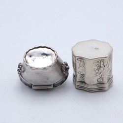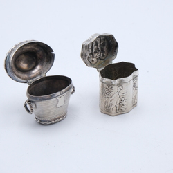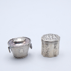 | Omschrijving | Lot van twee tweede gehalte (835/1000) lodereindoosjes: Eén 19e eeuws, mandvormig, met twee grepen en schildje vooraan, mr. J.C.G. Cabboes, Leeuwarden (1828-1839). Met daarbij een 20e eeuws lodereindoosje in 18e eeuwse stijl, met twee mannen met druiventros op de deksel (Exodus 13). Mr. P. Baardwijk, Nieuwpoort (1926-1942) |