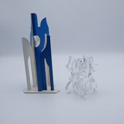 | Omschrijving | Twee perpex design vormstukken. Moderne abstracte voorstellingen. Een blauw/wit en een helder exemplaar |