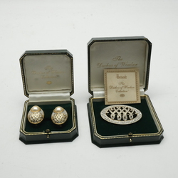 | Omschrijving | Lot van twee 20e eeuwse sieraden, broche en oorclips. Gemerkt ‘the Dutchess of Windsor Collection’, in Harrods doosjes |