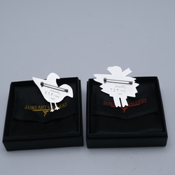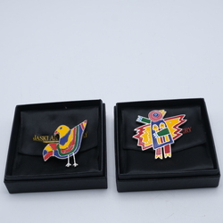 | Omschrijving | Twee witmetalen met emaille vogel broches. Onwerp van Corneille, )1922-2010). Gelimiteerde uitgaves 517 en 727 /1000. Uitgeven door de Jaksi art gallery Amsterdam, 1997. In originele doosjes. |