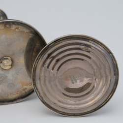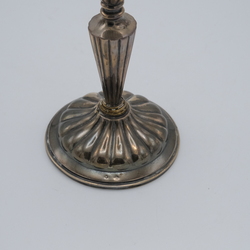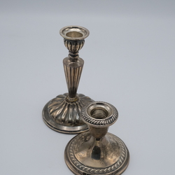 | Omschrijving | Lot van twee zilveren kandelaars: een eerste gehalte (925/1000) zilveren kandelaar, gemerkt Gorham Sterling. Met daarbij een grotere tweede gehalte (835/1000) zilveren kandelaar met cannelures. |
