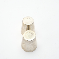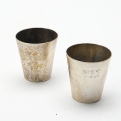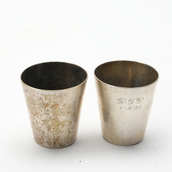 | Omschrijving | Twee 20e eeuwse tweede gehalte (835/1000) zilveren shotglaasjes. Gemerkt met initialen ‘D.T.P.’ en gedateerd 1937 en 1938. Voorschoten, 1937 |