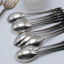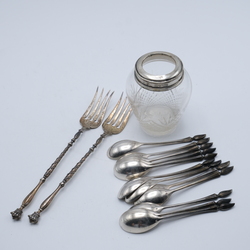 | Omschrijving | Twee antieke 2e gehalte, 835/1000 zilveren zuurvorken aan een getorste steel en bekroond met kroontje. Een kristallen lepelvaasje met hierin twaalf zilveren theelepels, bekroond met pluimpje. |