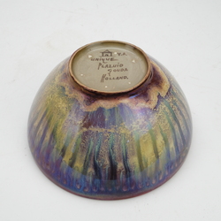 | Omschrijving | Een 20e eeuwse keramieken kom, gemerkt 'Unique Plazuid Gouda Holland'. Gemerkt Zuid-Holland, schildersmonogram V.A. = Henk Verburgt en Riemer Alkema, ca. 1950. Zgn. 'Unique Metallique' glazuur |